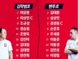 원정팀 자격으로 나서는 벤투호는 전방에 이정협(부산아이파크)을, 2선에 김인성, 이동경(이상 울산현대), 이동준(부산아이파크)을 배치한다. 중원은 주세종(FC서울)과 손준호(전북현대)가 지키고 포백 수비라인은 심상민, 권경원(이상 상주상무), 김영빈(강원FC), 김태환(울산현대)이 채운다. 골키퍼 장갑은 조현우(울산현대)가 낀다.