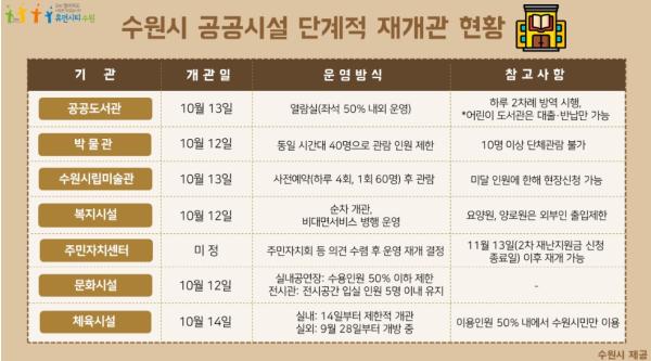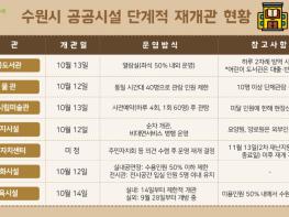 정부가 ‘사회적 거리두기’ 단계를 10월 12일부터 1단계로 조정하면서 수원시가 공공시설을 제한적으로 개관한다.