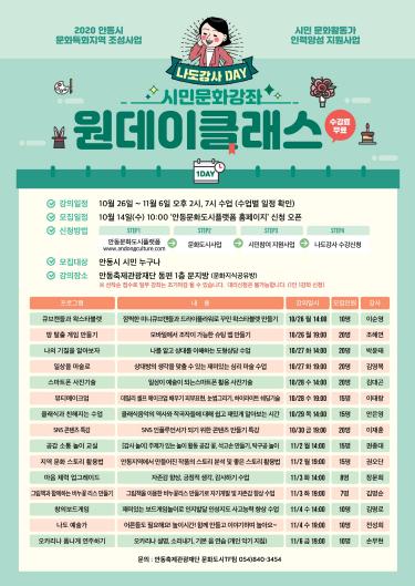 안동시와 안동축제관광재단에서 문화특화지역 조성사업의 일환으로 시민문화강좌 수강생을 모집한다. 이번 문화강좌에서는 앞서‘나도 강사’1~3기 수업을 진행했던 강사들이 원데이클래스 수업을 진행한다.