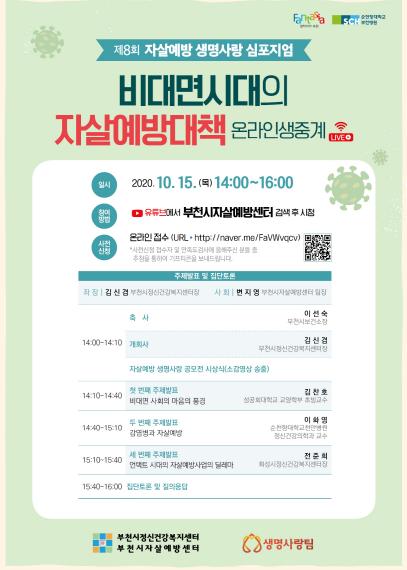 부천시는 오는 10월 15일 ‘비대면 시대의 자살예방 대책’이라는 주제로 생명사랑 심포지엄을 온라인 생중계할 예정이다.