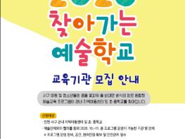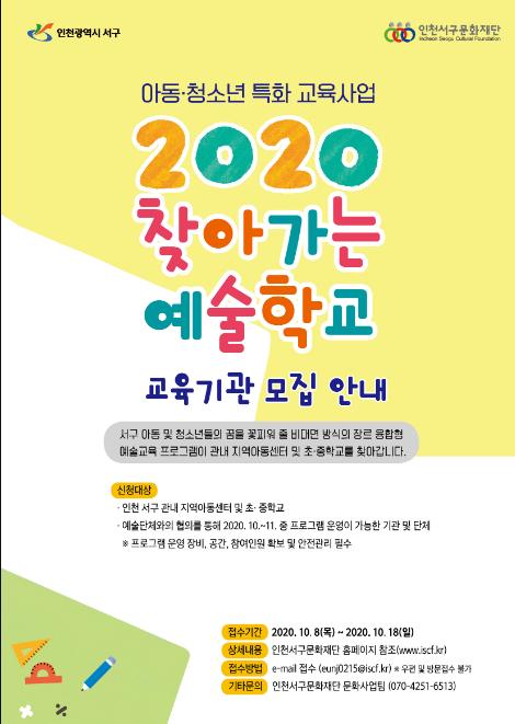 인천서구문화재단은 오는 10월 18일(일)까지 아동·청소년 특화 교육사업 ‘찾아가는 예술학교’에 참여할 교육기관 및 단체를 모집한다.