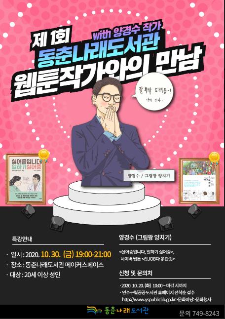연수구립 동춘나래도서관에서는 오는 10월 30일(금) 저녁 7시에 지역주민을 대상으로 양경수 작가와 함께하는 웹툰작가와의 만남 특강을 갖는다.