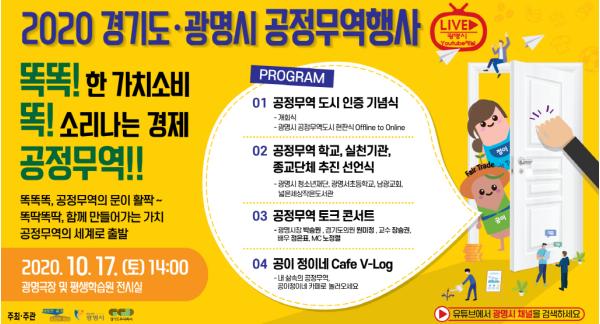 행사는 공정무역 도시 인증 기념식, 공정무역 학교·실천기관·종교단체 추진 선언식, 공정무역 토크 콘서트, 공정무역 쇼룸 둘러보기 등의 순서로 진행될 계획이며 광명시 공식 유튜브 채널 광명시광명씨를 통해 생중계 된다.