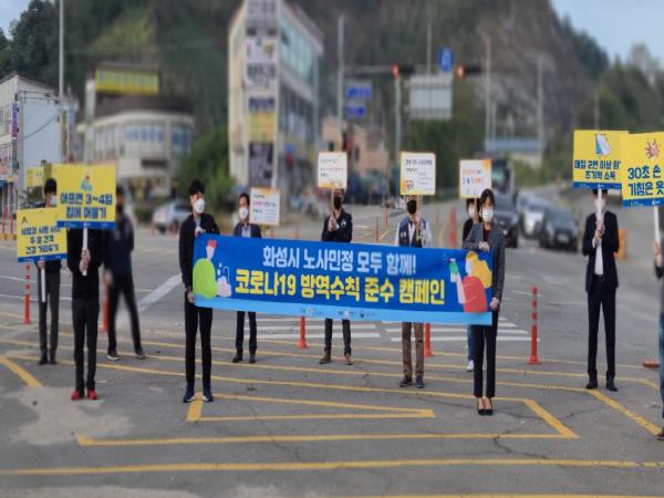 화성시노사민정협의회가 코로나19 예방과 근로환경 개선을 위한 출근길 거리 캠페인을 벌였다.