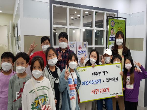 남양주시 다산동에 소재한 맨투맨 키즈는 지난 12일 어려운 이웃을 위해 준비한 라면 200개(12만원 상당)를 남양주시 사회복지관 서부희망케어센터(센터장 신영미)에 전달했다.