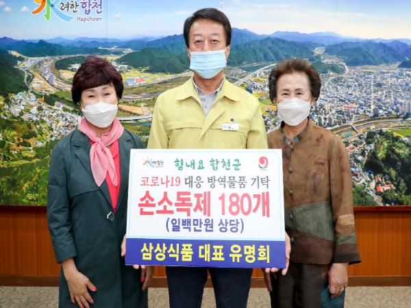 삼상식품 대표 유명희씨는 13일 합천군청을 방문해 코로나19 지역발생 예방을 위하여 써 달라며 손소독제 180개(1백만원 상당)을 기탁했다.