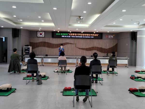 이번 교육은 코로나 19 확산으로 기존의 지역 민방위대장(통장) 교육이 사이버교육으로 대체됨에 따라 코로나19로 인해 올해 임명된이후 실습위주직무교육을 받지않은 신임통장을 대상으로 교육의 필요성이 제기되어 시 보건소 응급의료팀의 지원을 받아 북부동 행정복지센터 3층 대회의실에서 응급구조 교육위주로 진행되었다.