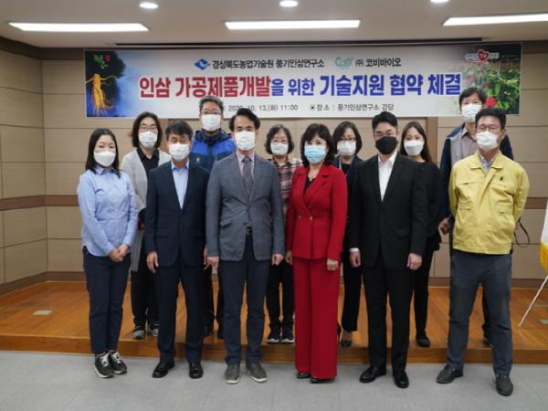 경상북도농업기술원 풍기인삼연구소는 13일 풍기인삼연구소 강당에서 ㈜코비바이오와 인삼가공제품개발 기술지원 업무협약을 체결했다.