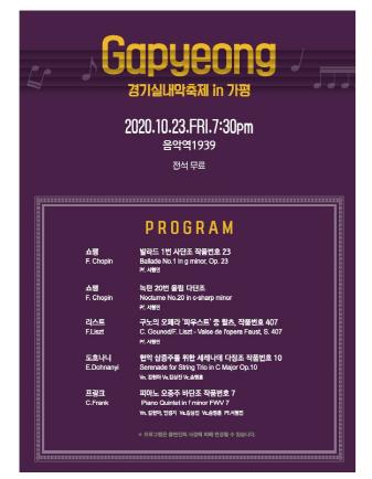 군 관계자는 “다양한 장르의 음악들이 음악역1939에서 연주되고, 군민들과 가평을 찾는 관광객들이 수준높은 클래식 실내악을 통해 삶의 위로와 희망을 느낄 수 있길 바란다”고 말했다.