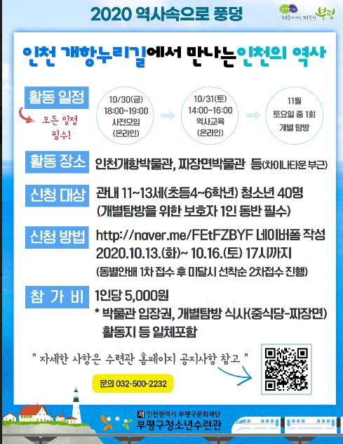부평구 청소년수련관이 오는 16일까지 역사 속으로 풍덩 ‘인천 개항누리길에서 만나는 인천의 역사’에 참여할 부평지역 청소년을 모집한다.