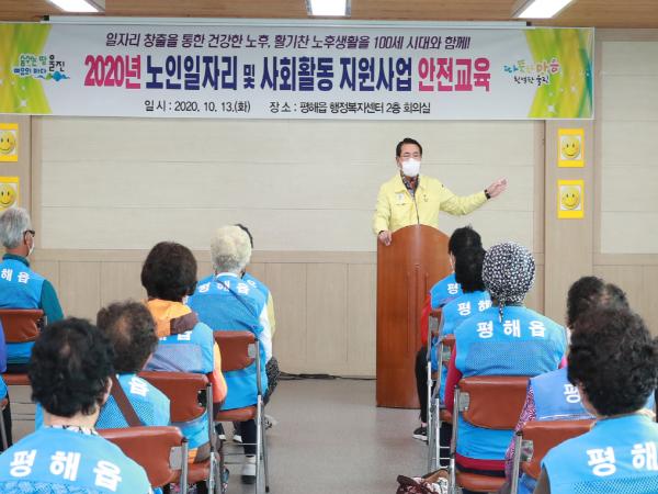 평해읍은 지난 13일 평해읍사무소 2층 회의실에서 노인일자리사업에 참여한 어르신 126명과 전찬걸 울진군수가 참석한 가운데 2020년 노인일자리사업 안전교육을 실시했다.