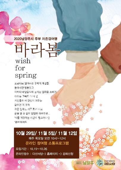 남양주시 평생학습원은 코로나19로 인한 사회적 거리 두기로 저하된 자존감 회복을 위해 오는 29일부터 3주간 남양주시 주부 30명을 대상으로 평생학습 웨비나(web semina의 합성어)의 첫 시리즈인 ‘바라 봄 wish for spring’을 개최한다.