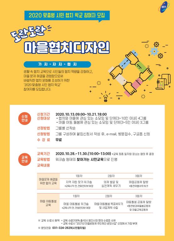 용인시는 협치 역량을 강화하고 주민 스스로 마을 문제를 해결할 수 있도록 ‘시민협치학교’과정을 개설해 참가자를 모집한다고 밝혔다.