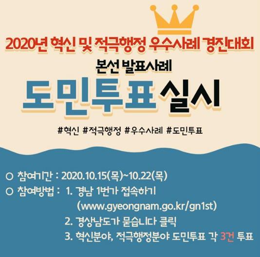경남도는 본선진출 우수사례에 대한 도민투표를 15일부터 22일까지 실시한다. 투표는 경남도 홈페이지 내 ‘경남1번가*’를 통해 진행된다.