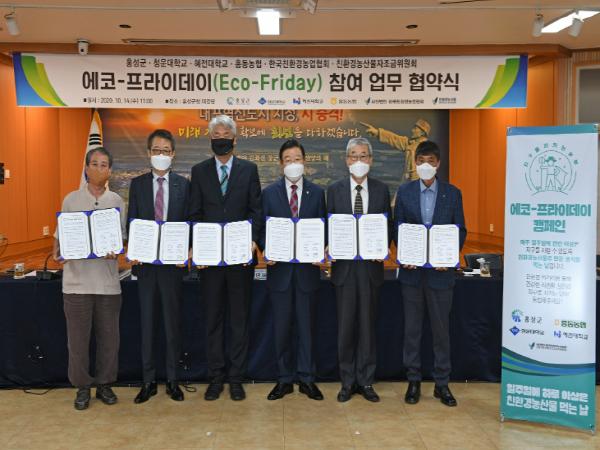 14일 홍성군은 김석환 군수와 김영재 한국친환경농업협회 회장 및 참여 기관·단체장 등 20여명이 참석한 가운데 청운대학교·혜전대학교·홍동농협·한국친환경농업협회·친환경농산물자조금위원회와 에코-프라이데이 참여 업무 협약을 맺었다.