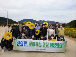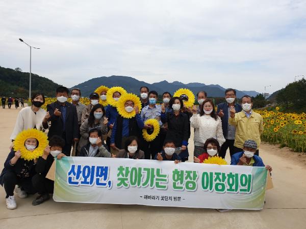 해바라기 꽃단지는 잡풀만 우거진 채 방치돼 있던 우범지역을 산외면 직원들과 마을 주민들이 2018년부터 자발적으로 산책로로 조성해온 것으로, 이날 회의에 참석한 공무원과 마을이장 등 30여명은 활짝 핀 해바라기, 백일홍, 댑싸리 등을 감상하며 코로나 19로 지친 마음을 힐링의 시간을 가졌다.