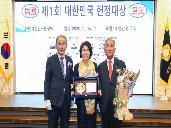 대한민국 헌정대상은 전?현직 국회의원 등 3,100명으로 구성된 대한민국헌정회에서 헌법가치 수호, 국리민복 증진, 국가 미래전략 수립, 국가인재 양성에 기여한 공적을 평가하여 주는 상으로 올해 첫 수상자를 배출하였다.