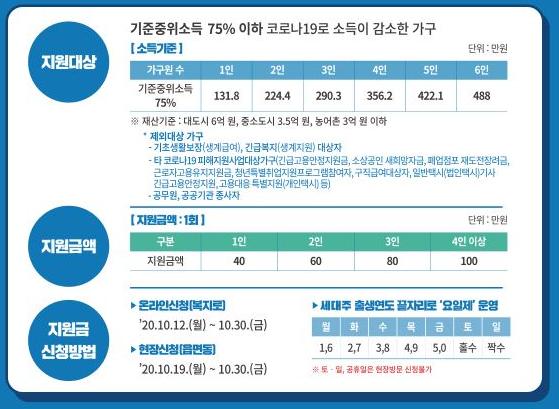 이번 지원은 정부의 2차 맞춤형 긴급생계지원금으로 지원 대상은 코로나19로 인해 가구소득이 25%이상 감소하고, 가구원 전체 소득의 합이 기준 중위소득의 75% 이하이며, 재산이 6억 원 이하인 가구다.