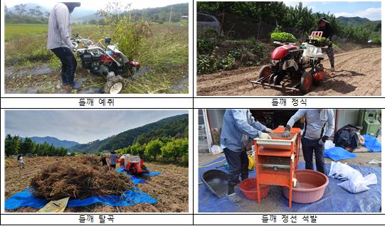 들깨 생산 과정 중 경운(흙갈이)과 땅 고르기, 피복(덮기), 방제 등은 기계로 할 수 있으나 정식, 수확 등은 기계가 대신하기 어려워 대부분 인력에 의존하고 있다.