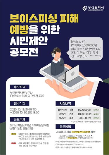 부산시가 최근 증가하고 있는 전화금융사기, 일명 ‘보이스피싱’ 피해 예방을 위해 전 시민을 대상으로 시민 제안 공모전을 추진한다고 밝혔다.