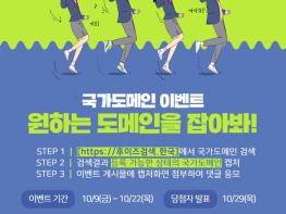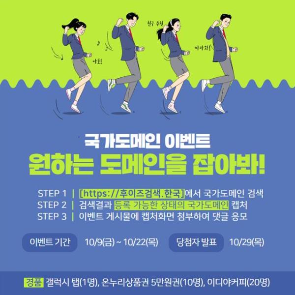 이번 이벤트는 국가도메인에 대한 인식을 높이고 이용을 활성화하기 위해 마련됐으며, 오는 10월 22일까지 KISA SNS를 통해 누구든 참여할 수 있다. 참여 방법은 ‘후이즈검색.한국’에서 희망하는 국가도메인을 검색한 뒤, 등록이 가능하다는 검색 결과를 캡처해 댓글로 응모하면 된다.
