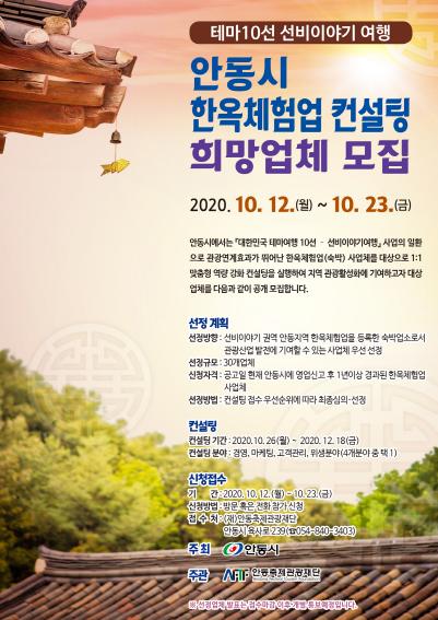 안동시는 안동축제관광재단과 함께 『대한민국 테마여행 10선 - 선비이야기여행』 사업 일환으로 관광사업체 중 한옥체험업종에 대한 역량강화 컨설팅 희망 업체를 공개모집한다.