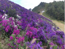 작년부터 부항댐 사면적 24,000㎡(약 7천평)에 숙근아스타(보라색국화) 20여 만본을 식재하고 제초, 예초, 비료주기, 적심 및 관수작업 등 초화류에 대하여 유지 관리해 오고 있으며, 특히 올해는 댐 사면 중간부분에 하트 및 물결모양으로 금방울꽃(노란색국화) 2만 5천본을 포인트 식재하였다.