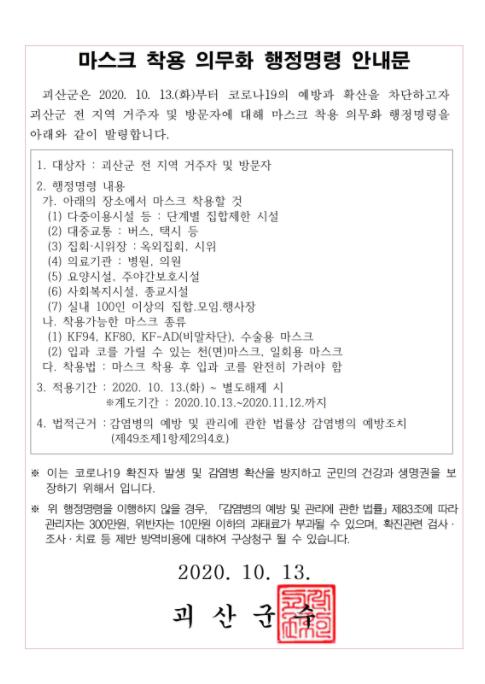 이에 따라 괴산군 전 지역의 거주자와 방문자는 행정명령 대상 시설에서 반드시 마스크를 착용해야 한다.
