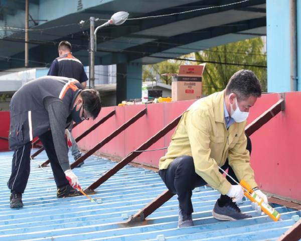 구는 그간 시설 이용자들이 가장 큰 불편사항으로 지적해 왔던 내부 누수 문제를 해결하기 위해 시설물 외부 천정 이음새 실리콘 작업 및 원활한 배수를 위한 퇴적물 정비 작업 등을 실시했다.