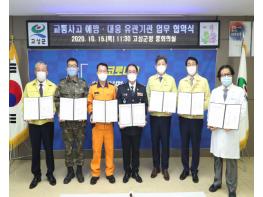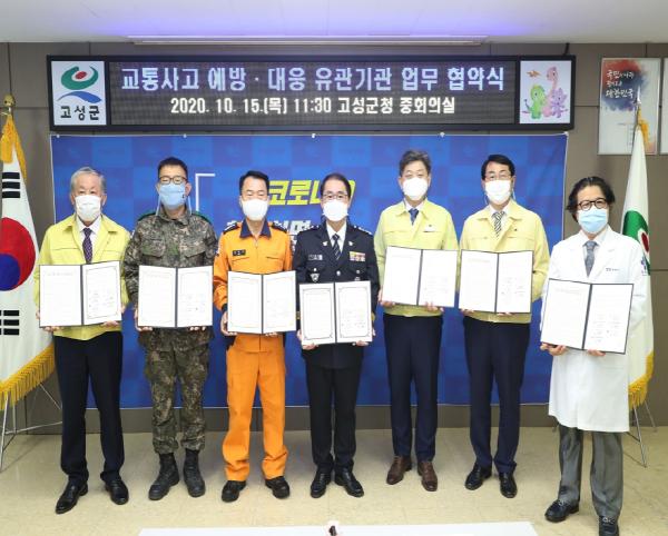 10월 15일 고성군청 중회의실에서 군수, 의회의장, 교육장, 경찰서장, 소방서장, 2대대장, 강병원 원장 등 7개 기관 대표가 모여 지역 교통사고 예방·대응 유관기관 업무 협약서에 서명한 뒤 교통사고 예방대책 등을 논의했다.