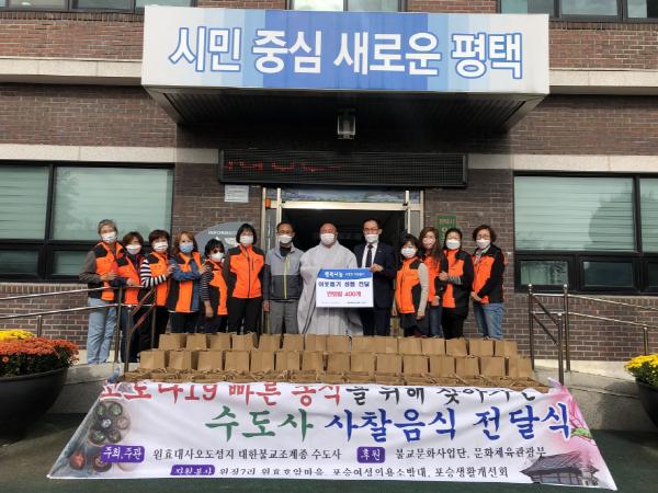 평택시 포승읍 소재 대한불교조계종 수도사(주지 적문)는 15일 평택시 안중출장소를 방문해 어려운 이웃들에게 전달해 달라며 연잎밥 400개를 기탁했다.
