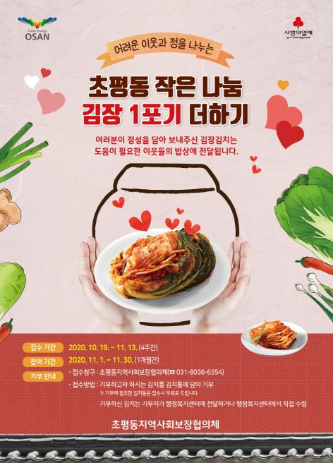 오산시 초평동지역사회보장협의체(민간위원장 김행심)는 ‘작은나눔 김장1포기 더하기’행사를 위한 김장 김치 기부자 및 배부자를 오는 19일부터 신청?접수 받는다.
