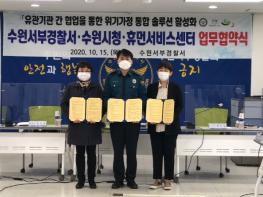 수원시와 수원시휴먼서비스센터, 수원서부경찰서는 15일 수원서부경찰서에서 업무협약을 체결하고, 위기가정 문제해결·지원을 위한 협력체계를 강화하기로 했다.