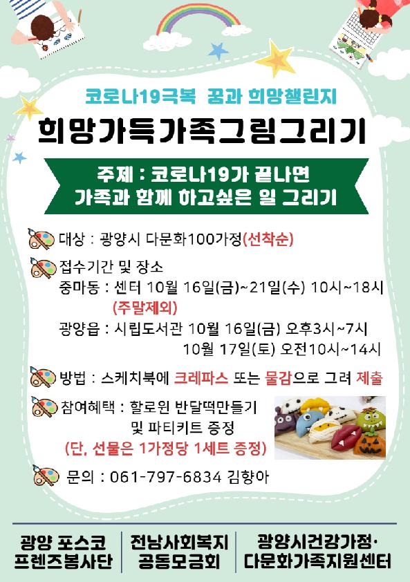 광양시건강가정·다문화가족지원센터(센터장 손경화)는 오는 16일부터 21일까지 포스코 프렌즈봉사단, 전남사회복지공동모금회와 함께 코로나19 극복 꿈과 희망 챌린지 ‘희망가득 가족그림 그리기’ 프로그램을 운영한다.