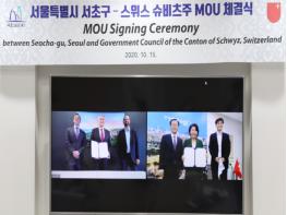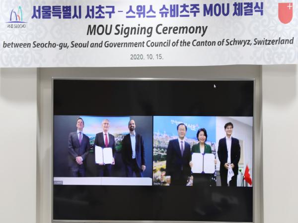 서울 서초구는 블록체인 선도도시 중 하나인 스위스 슈비츠주(Schwyz)와 화상통화를 통해 스마트도시 관련 사업 및 경제활성화를 위한 우호협력의향 협약서(MOU)을 온택트(On-tect)체결했다.