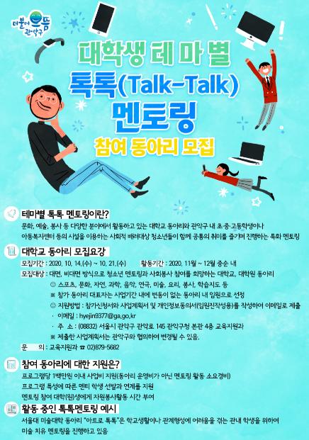 관악구가 재능기부 사업으로 진행하는 대학생 테마별 톡톡[Talk-Talk] 멘토링 참여 동아리를 오는 21일(수)까지 추가 모집한다.