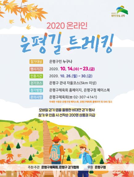 은평구청과 은평구체육회(회장 박낙흥)는 은평구걷기협회(회장 김인용)와 함께 코로나-19 바이러스 확산에 따른 비대면 걷기 행사인‘온라인 은평길 트레킹’을 개최한다고 밝혔다.