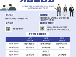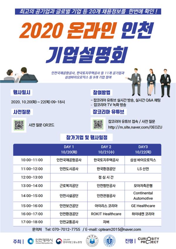 인천광역시와 중부지방고용노동청, 인하대, 인천대가 공동개최하는‘2020 온라인 인천 기업설명회’가 10월 20일(화)부터 10월 22일(목)까지 사흘간 잡코리아TV(유튜브)에서 송출된다.