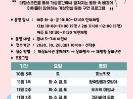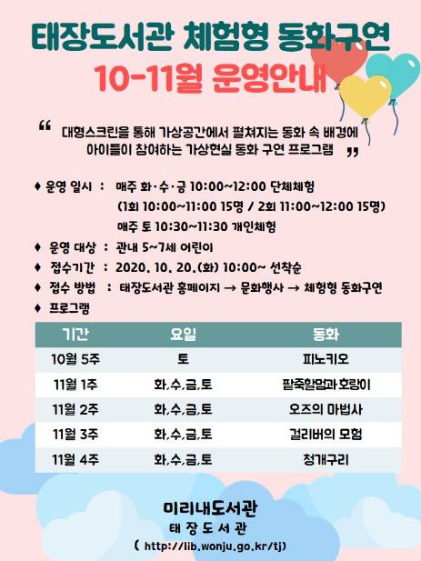 태장도서관 체험동화관에서 매주 화·수·금요일 오전 10시부터 12시까지 어린이집 및 유치원 등 단체 체험, 매주 토요일 오전 10시 30분부터 11시 30분까지 개인 체험으로 진행된다.