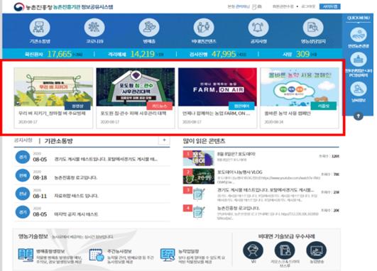 이번에 개편한 농촌진흥기관 정보공유시스템은 각 기관의 우수한 영농기술정보 확산을 위한 기관 소통방을 개설하고, 짧은 동영상과 카드뉴스 등 가독성 높은 비대면 농업기술 콘텐츠 게시, 기관별 비대면 기술보급 우수사례 등을 소개해 농업현장에서 체감하는 영농지도를 위한 길잡이 역할을 하고 있다.