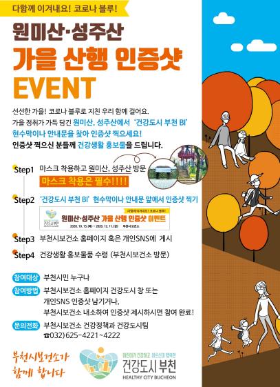 부천시보건소에서는 10월 15일부터 「다 함께 이겨내요! 코로나블루, 원미산·성주산 가을 산행 이벤트」를 개최한다.