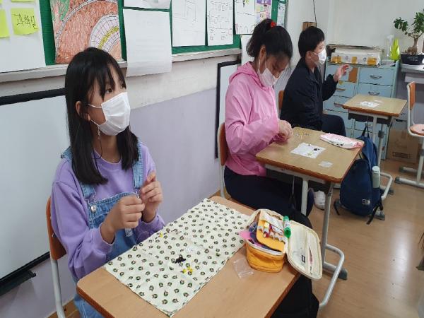 완주군청소년수련관 청소년운영위원과 청소년지도사가 직접 삼례중앙초등학교로 찾아가 마스크 목걸이 만들기를 지도했다.