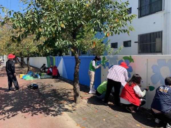 특히 이번 사업은 코로나19 방역수칙을 준수하며 진행됐으며 송학동 걷기코스 1코스에 위치한 이화아파트 담장에‘영생(永生, 건강하게 오래도록 삶)’을 뜻하는 맨드라미를 중심으로 벽화그리기와 정원가꾸기 사업을 시행하여 아름다운 벽화와 어우러진 새로운 길로 재탄생되었다.
