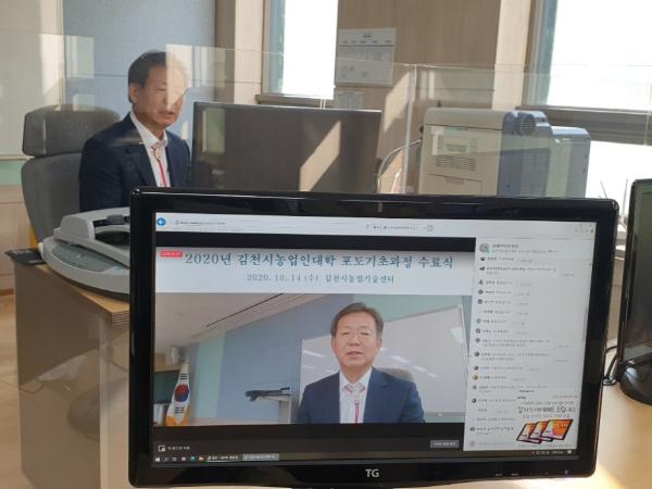 2020년 김천시농업인대학은 늘어나는 샤인머스캣 재배 농가의 교육 수요에 부응하여 포도기초과정 50명, 포도심화과정 50명의 교육생을 대상으로 5월 13일 개강해 10월 15일까지 총 24회 124시간(각 과정당 12회, 62시간) 교육을 추진했다. 이 중 총 10회(과정당 5회)의 교육을 비대면 온라인교육으로 실시한 바 있으며, 수료식 역시 코로나-19 확산 방지를 위해 비대면 수료식으로 개최한 것이다.
