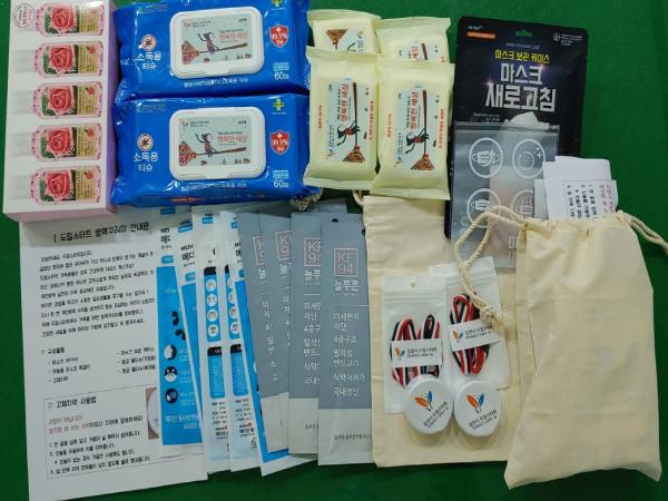 이번 코로나19 방역꾸러미는 일상생활 속에서 감염을 예방하는 습관을 키우는데 중점을 두고 방역마스크(KF94)를 비롯한 마스크걸이는 물론 가족들이 함께 사용 할 수 있는 항균티슈와 손소독제, 휴대용 고체치약과 각종 위생용품들을 휴대할 수 있도록 파우치에 넣어서 배부할 계획이다.