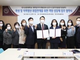 충주시(일자리종합지원센터)는 이달 15일 한국교통대학교 대학일자리개발원 휴스퀘어회의실에서 한국교통대학교(대학일자리개발원)와 ‘직업상담사 교류’에 관한 업무협약을 체결했다.