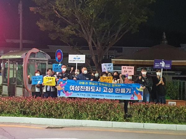 고성군은 지역 내 여성 범죄 예방을 위해 10월 15일 오후 7시, 고성읍 일원에서 고성군 안전지킴이단 “핑!고!”를 주축으로 군민참여단(안전증진분과), 아동·여성안전지역연대, with you 지킴이단, 고성가족상담소, 고성경찰서와 함께 안전취약지역 점검 및 안심귀가 거리 캠페인을 실시했다.