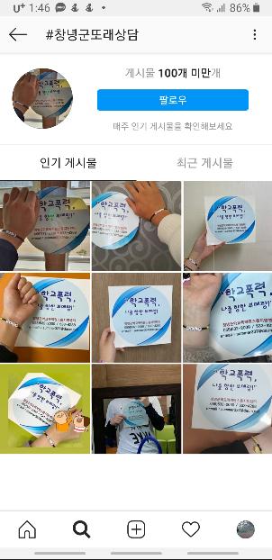 창녕군은 지난 15일 창녕군 또래상담자 100명을 대상으로 인스타그램, 페이스북 등 SNS를 활용한 학교폭력예방 랜선 캠페인 ‘마음도움’을 실시했다.