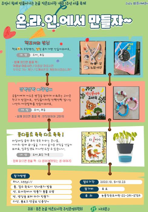 ‘얘들아! 책이랑 놀자’와 ‘온라인에서 만들자’는 영상을 시청하며 만들기를 체험하는 프로그램으로, 이달 26일부터 자원활동가가 그림책 읽기와 책놀이 하는 영상 및 키트를 만들어 신청자들에게 나누어 준다.