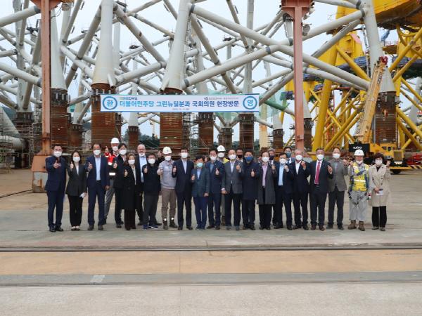 그린뉴딜분과 위원장 이학영 의원을 비롯해 김성환, 김정호, 김경만, 김영배, 김원이, 신정훈, 양이원영, 이동주, 이성만, 이소영 등 총 11명의 국회의원들이 함께 한 이번 현장방문에서는 삼천포화력발전소 및 영농형태양광 실증사업현장과 삼강S&C 해상풍력 플랜트 제조현장을 시찰했다.